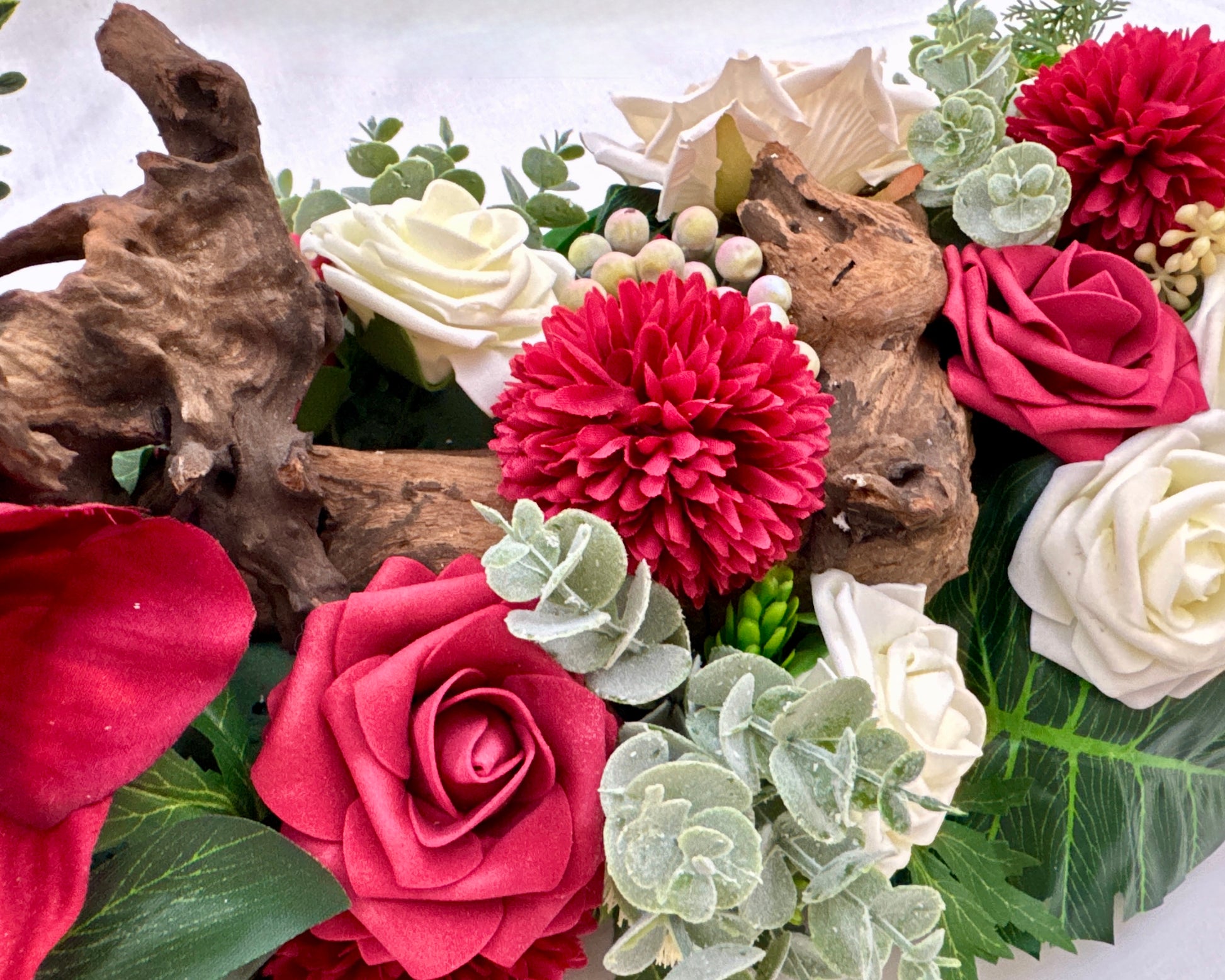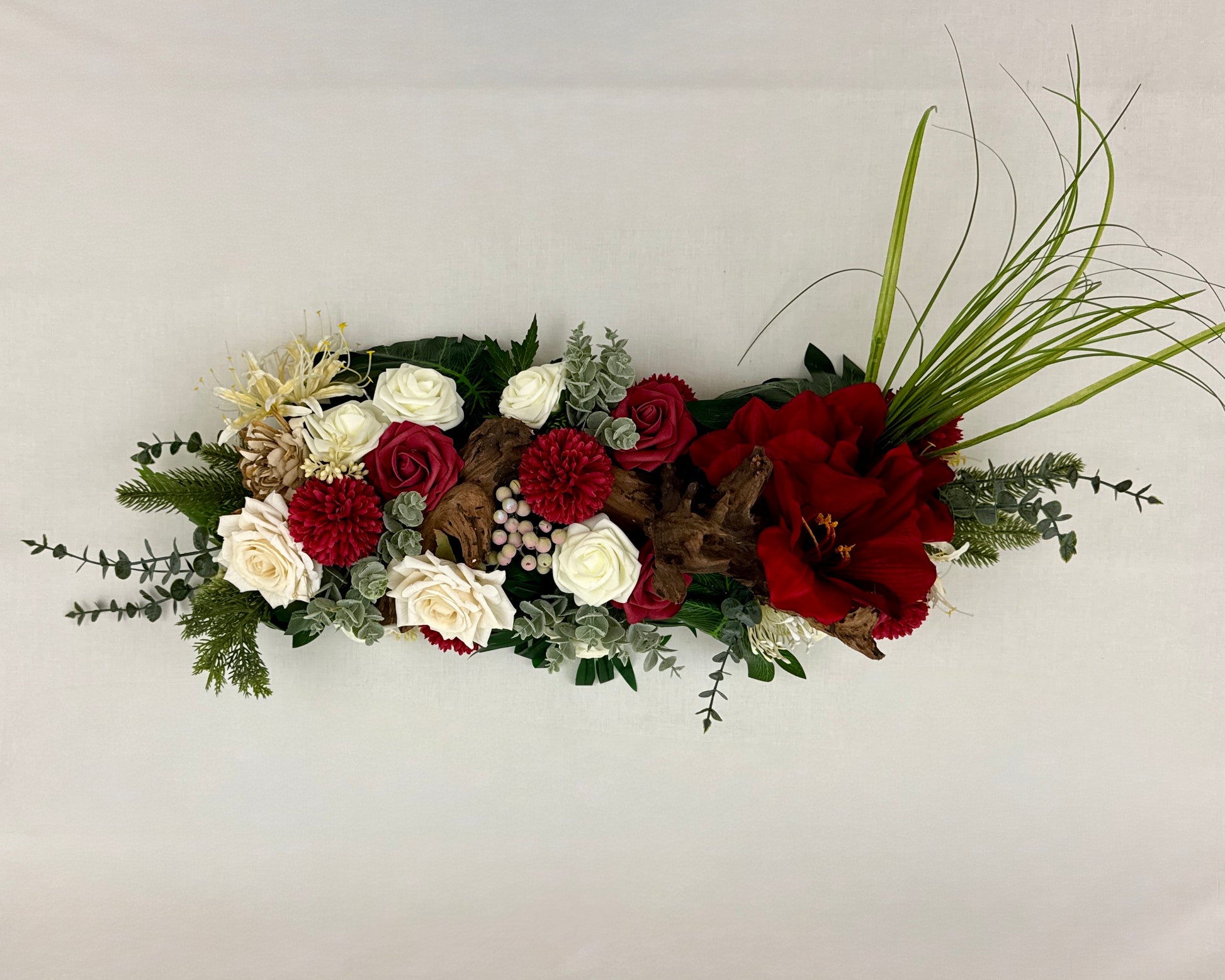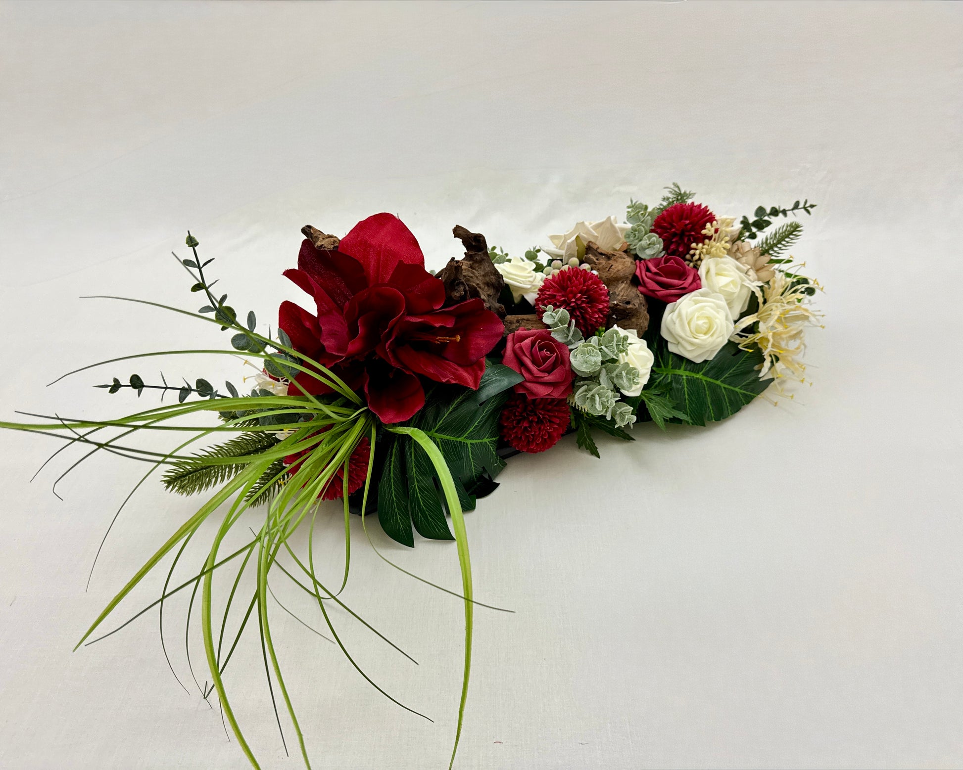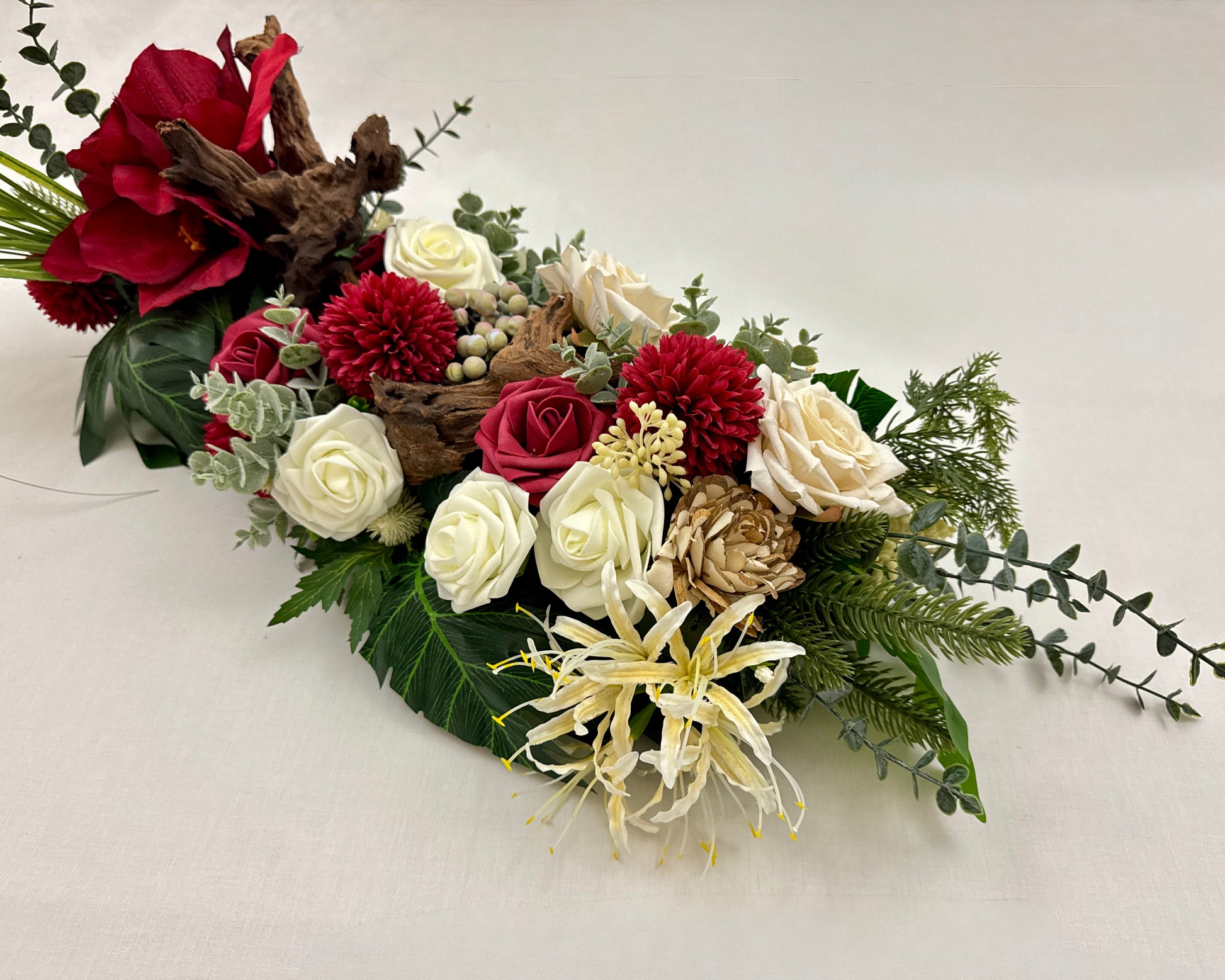 Een groot en indrukwekkend kiststuk dat direct in het oog springt door de diepe rode tinten, sierlijke witte bloemen en robuuste natuurlijke accenten. Dit langwerpige stuk is royaal van formaat en uitdrukking. Een krachtig en liefdevol gebaar dat écht aanwezig is bij het afscheid.