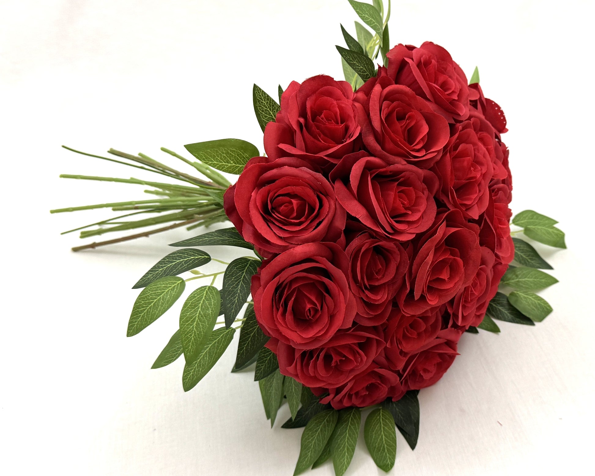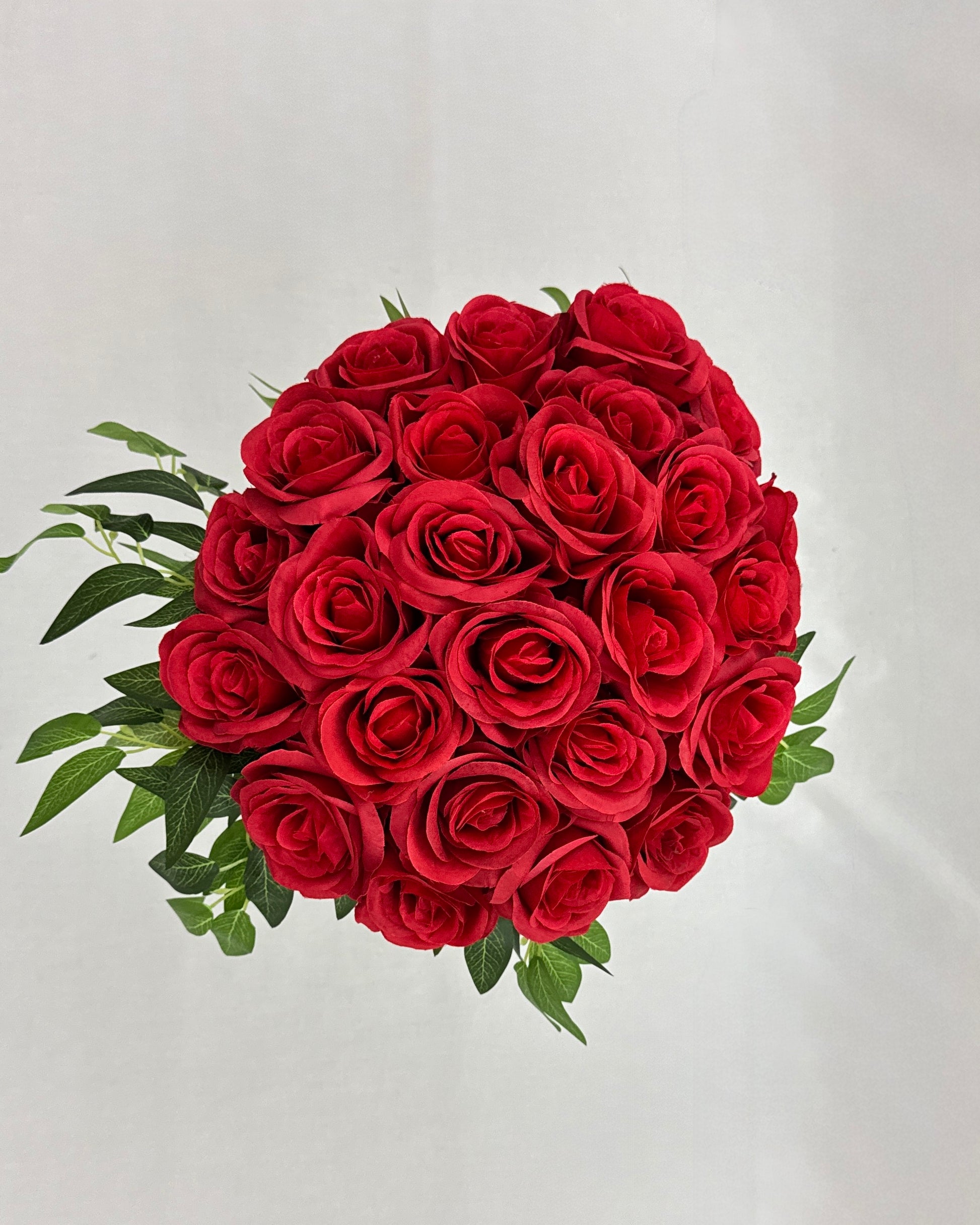 Dit stijlvolle rouwboeket toont een krachtig boeket van rode rozen, rechtopstaand en strak geschikt. Het arrangement straalt liefde, bewondering en waardigheid uit en vormt een indrukwekkend eerbetoon bij een uitvaart.